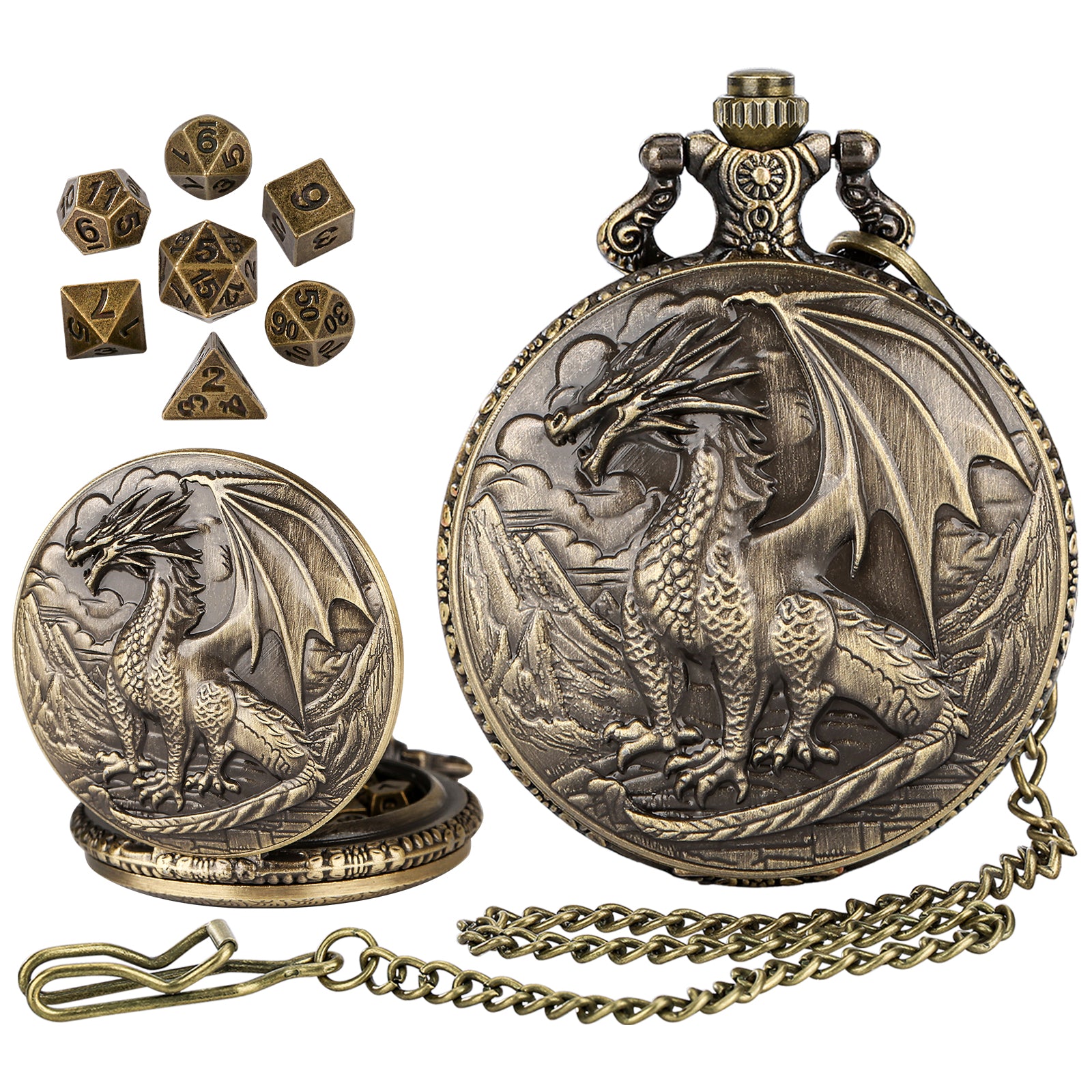 Claim your territory and safeguard your fate with The Apex Dragon Hidden Dice Set . This majestic, pocket watch-style dice vault features a powerful, classic dragon perched on a craggy peak, ruling over its domain.